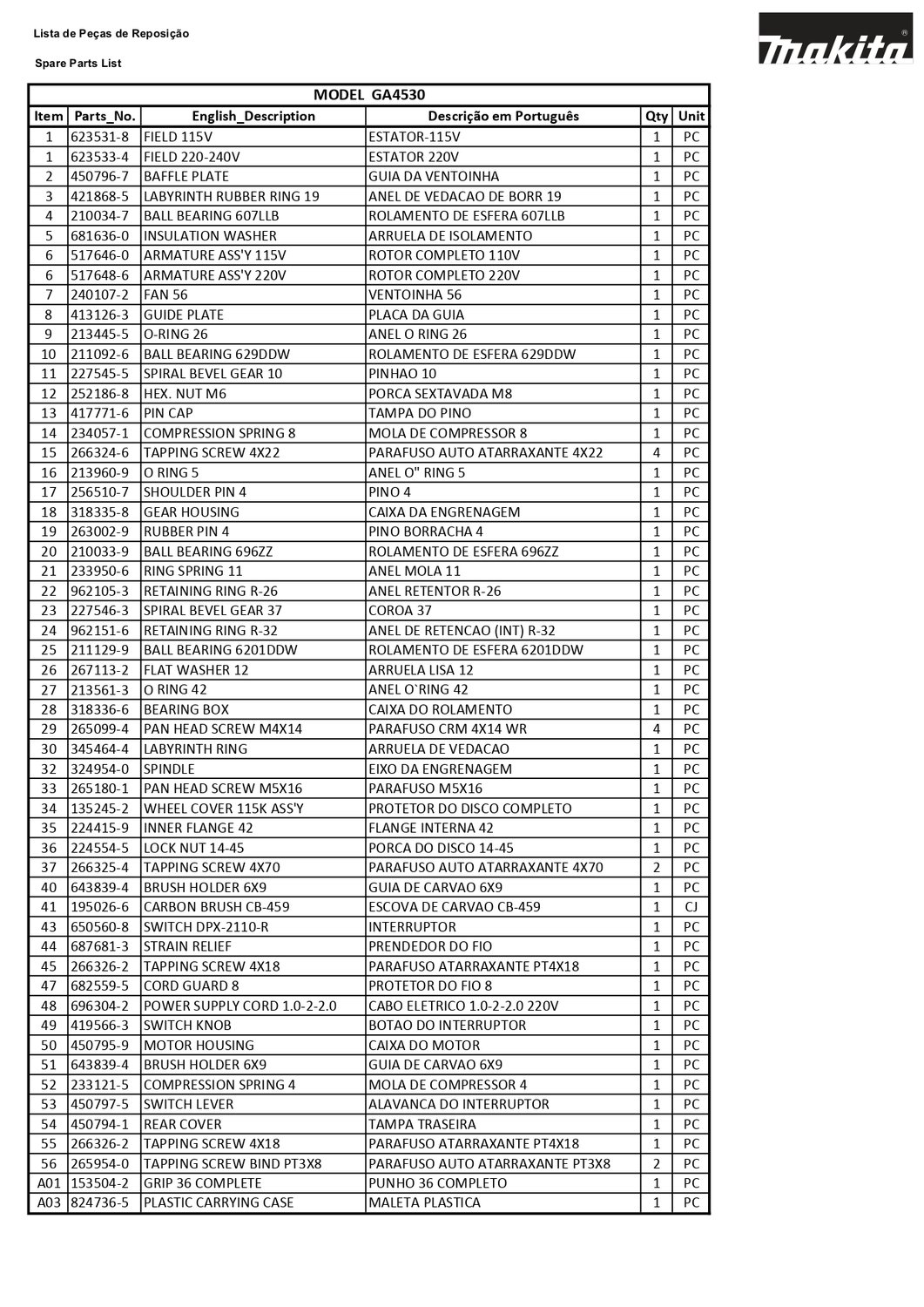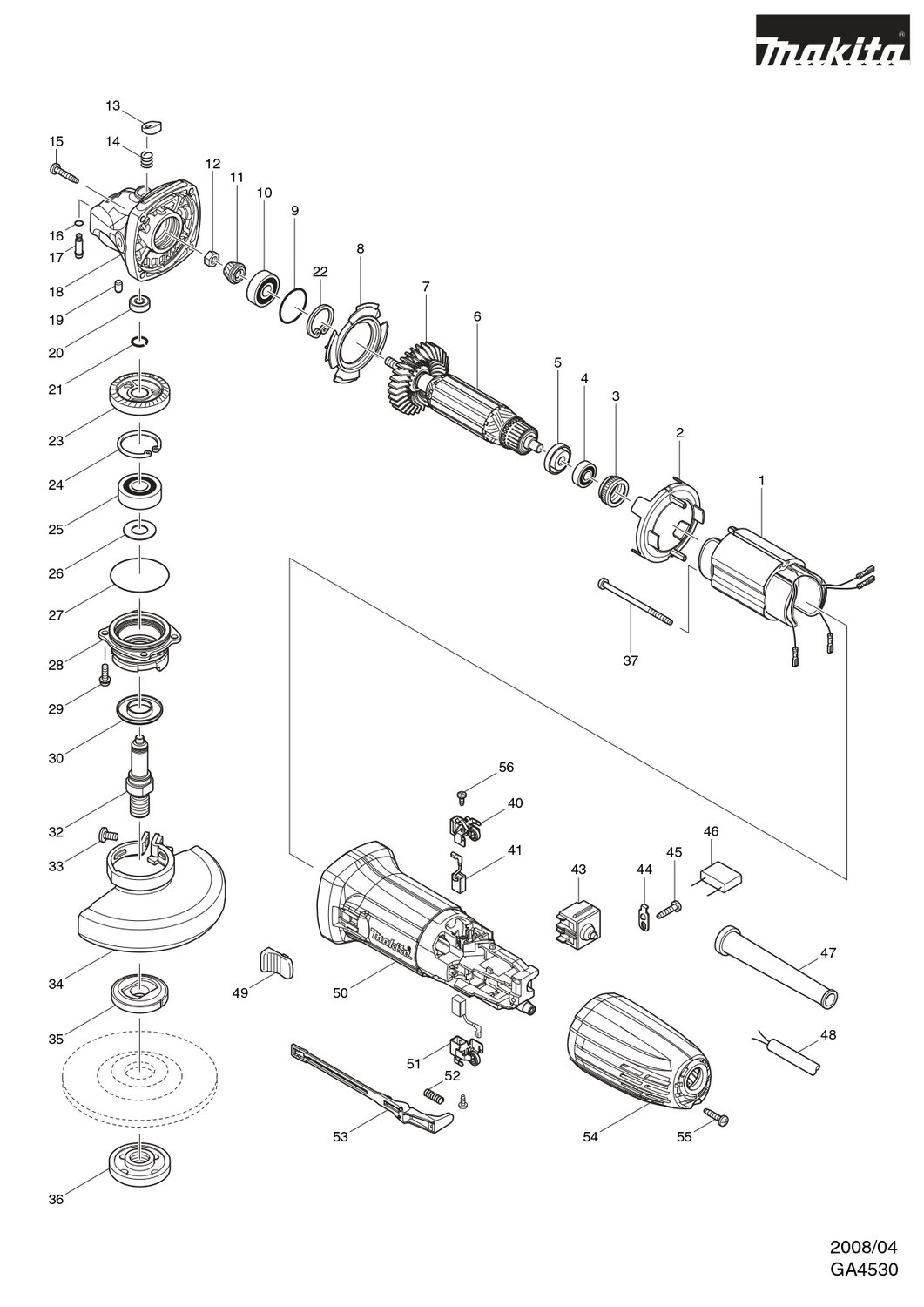 Vista Explodida da Esmerilhadeira GA4530 Makita